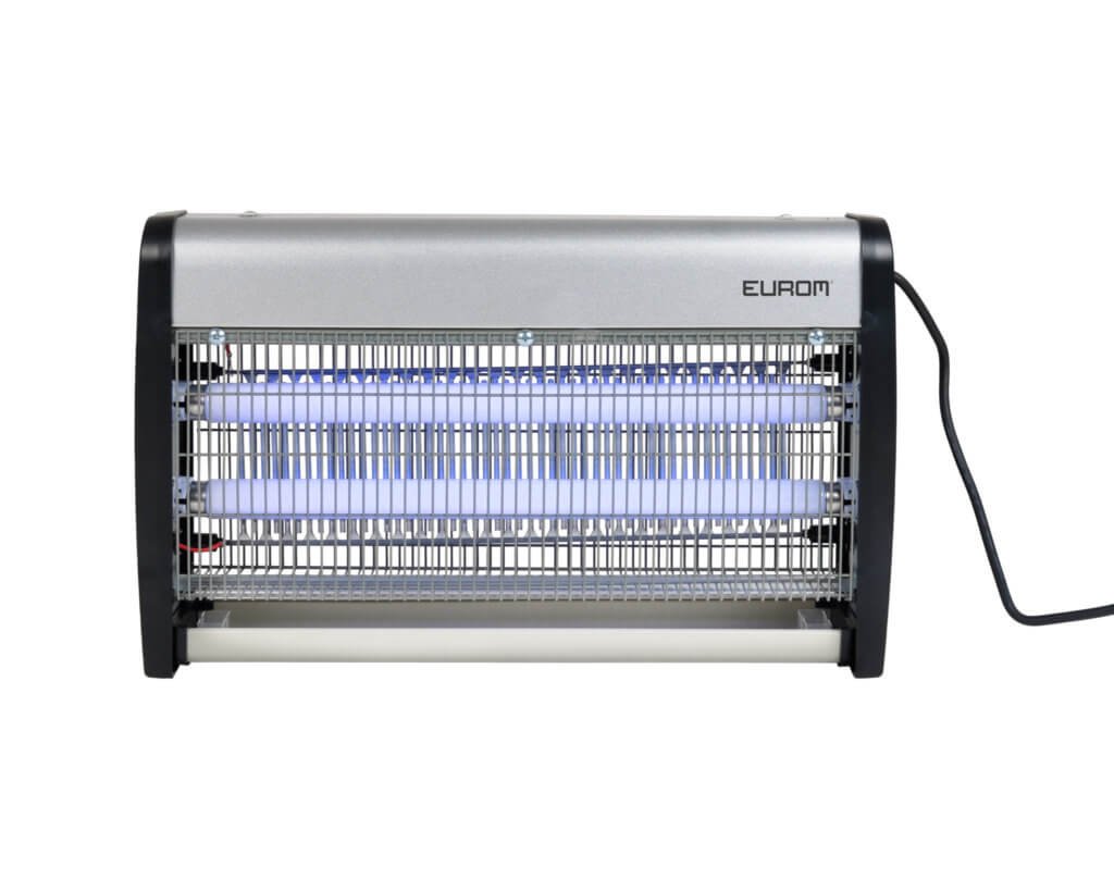 El Eurom Fly Away Metal 30-2 es un potente insecticida que funciona mediante luz ultravioleta y una rejilla de alto voltaje. Las dos luces ultravioleta de 15 vatios atraen a los insectos, que vuelan hacia la rejilla de 2500 voltios. Para una mayor atracción, puede colocar el atrayente en un depósito especial.