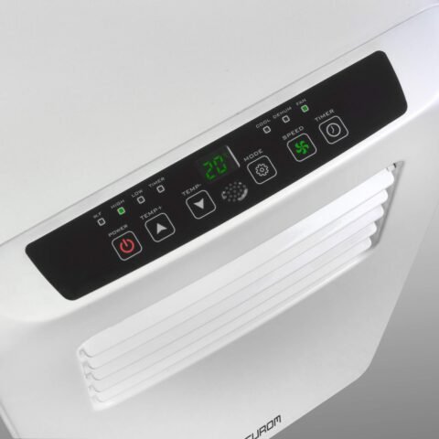 El Eurom PAC 9.2, con 2600 vatios y 9000 BTU, es apto para enfriar habitaciones de hasta 80 m³. El aire acondicionado tiene dos velocidades y también funciona como deshumidificador. Deshumidifica hasta 1,2 litros por hora a través de la manguera de desagüe. El PAC 9.2 incluye control remoto y temporizador.