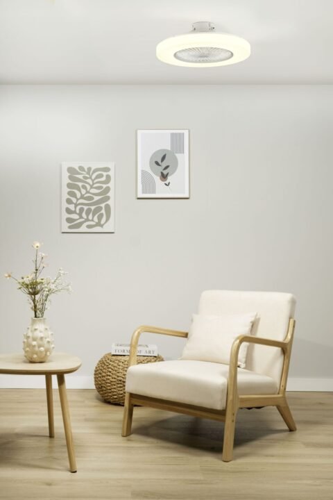 El ventilador ofrece una refrigeración agradable, mientras que la lámpara integrada permite iluminar la estancia sin necesidad de instalar luminarias adicionales. Este diseño es especialmente práctico para habitaciones pequeñas o medianas, combinando comodidad, eficiencia y funcionalidad en un solo dispositivo.
