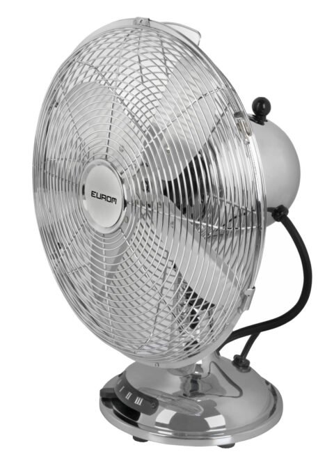 El Eurom VTM 12 es un ventilador de tafel metálico robusto. La puerta tiene un diseño diferente y el ventilador no está en ningún lugar.